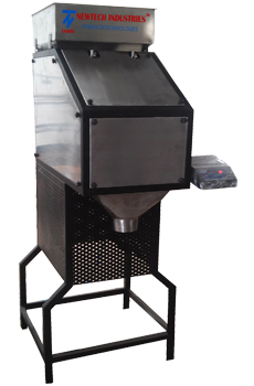 A vibrating feeder where the products are feed into the weighing hopper. A load cell continuously weighs the product and once the pre set weight is achieved the machine automatically closed the gate. Next one has to hold the packet at the discharge outlet and press the foot operated switch to discharge the product. After the release of weighed product the machine restarts the process.